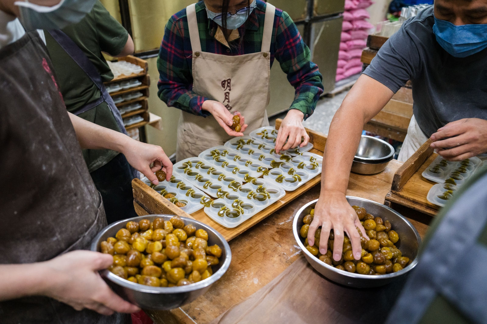為了處理年前大量訂單,只能暫停營業,將人力集中在後場製作。廚房裡一刻不得閒,一顆顆和菓子被迅速封箱、搬上貨車,送往其他分店。