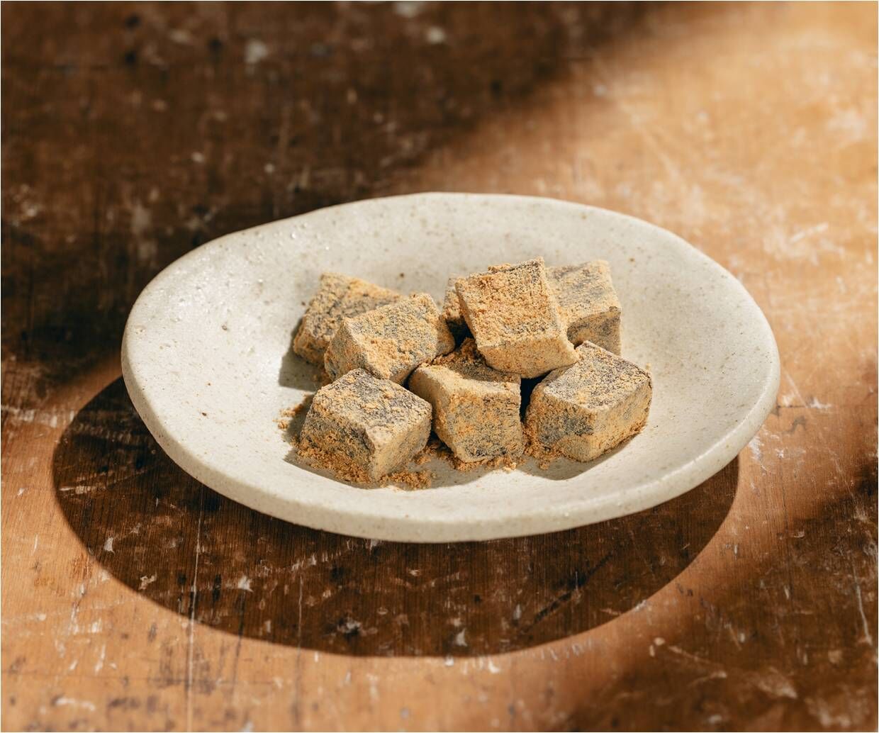 由黑糖、米、黃豆粉製成,應該算是普及度和接受度都很高的和菓子,我之前去日本旅行時三不五時就會吃到。黃豆粉的清香、咀嚼後黑糖帶著香氣的甜、Q 彈的口感,明月堂的柔玉越吃越涮嘴,給得很大方的黃豆粉也令人滿意。