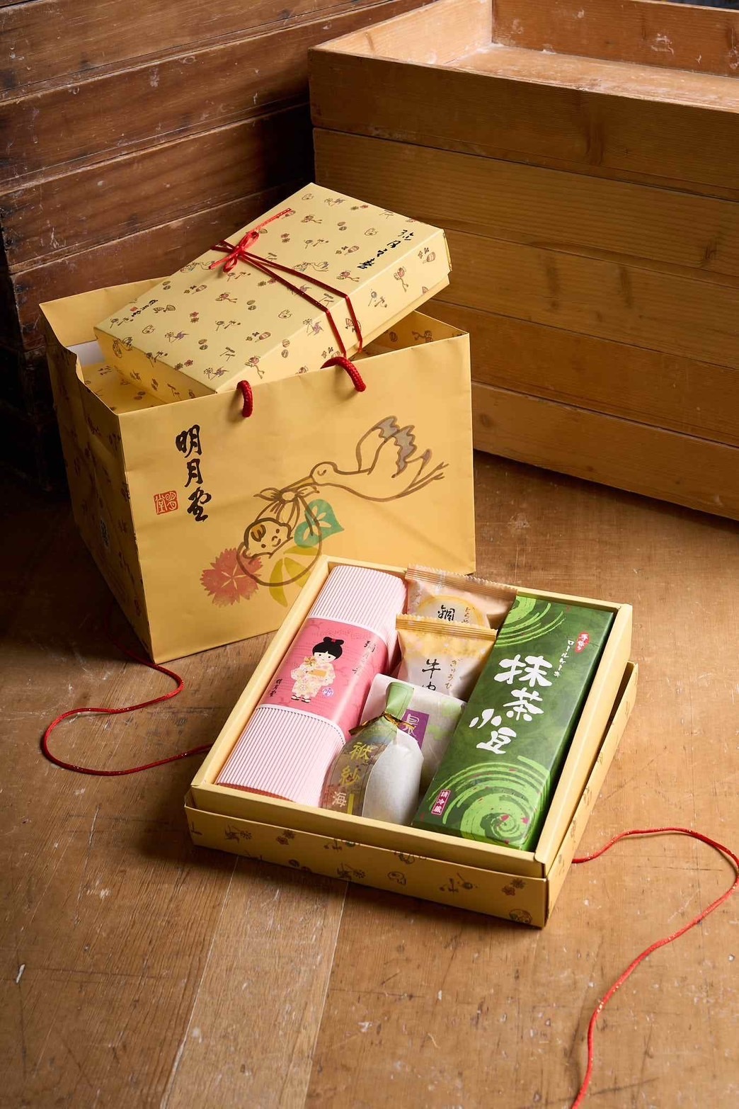 明月堂的和菓子彌月禮盒,以經典羽二重餅、銅鑼燒、牛皮等代表作組合呈現,不添加油脂與防腐劑,為新生家庭與親友傳遞最純粹的心意。