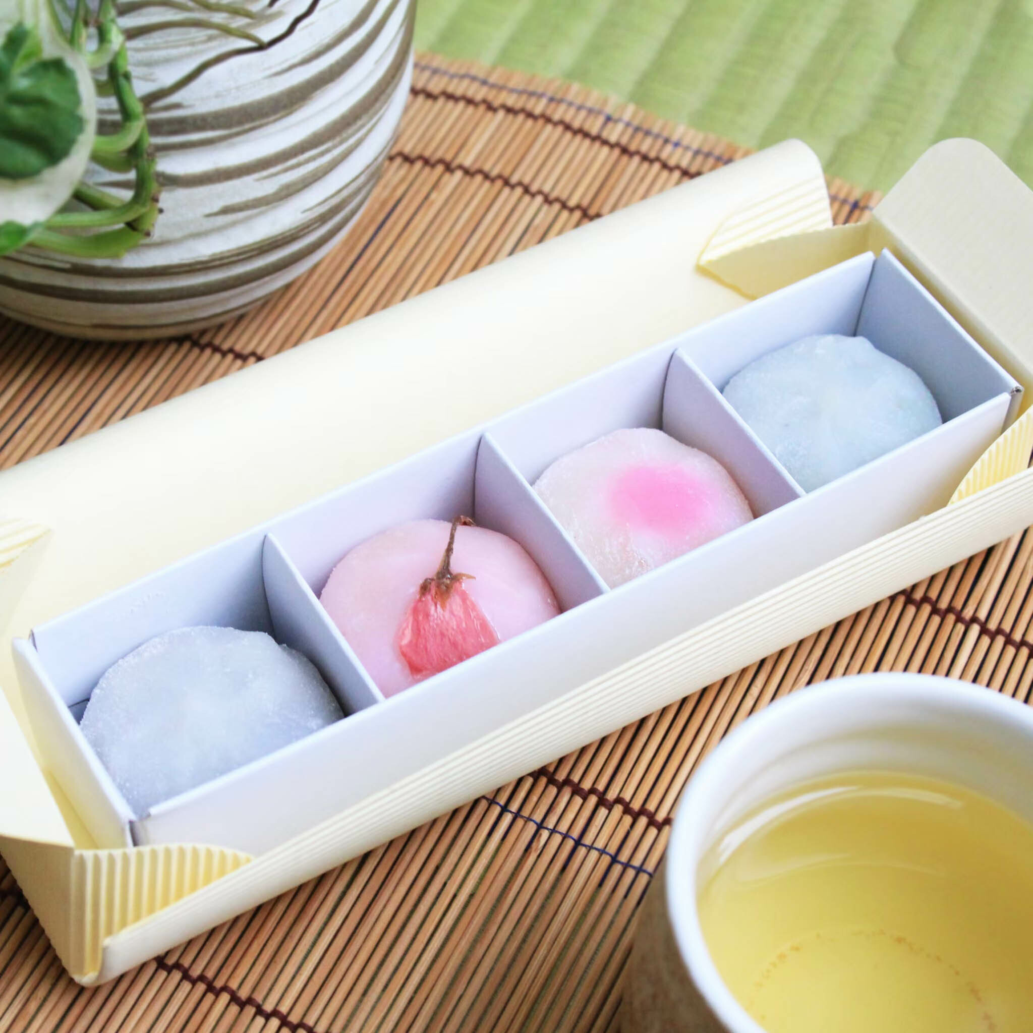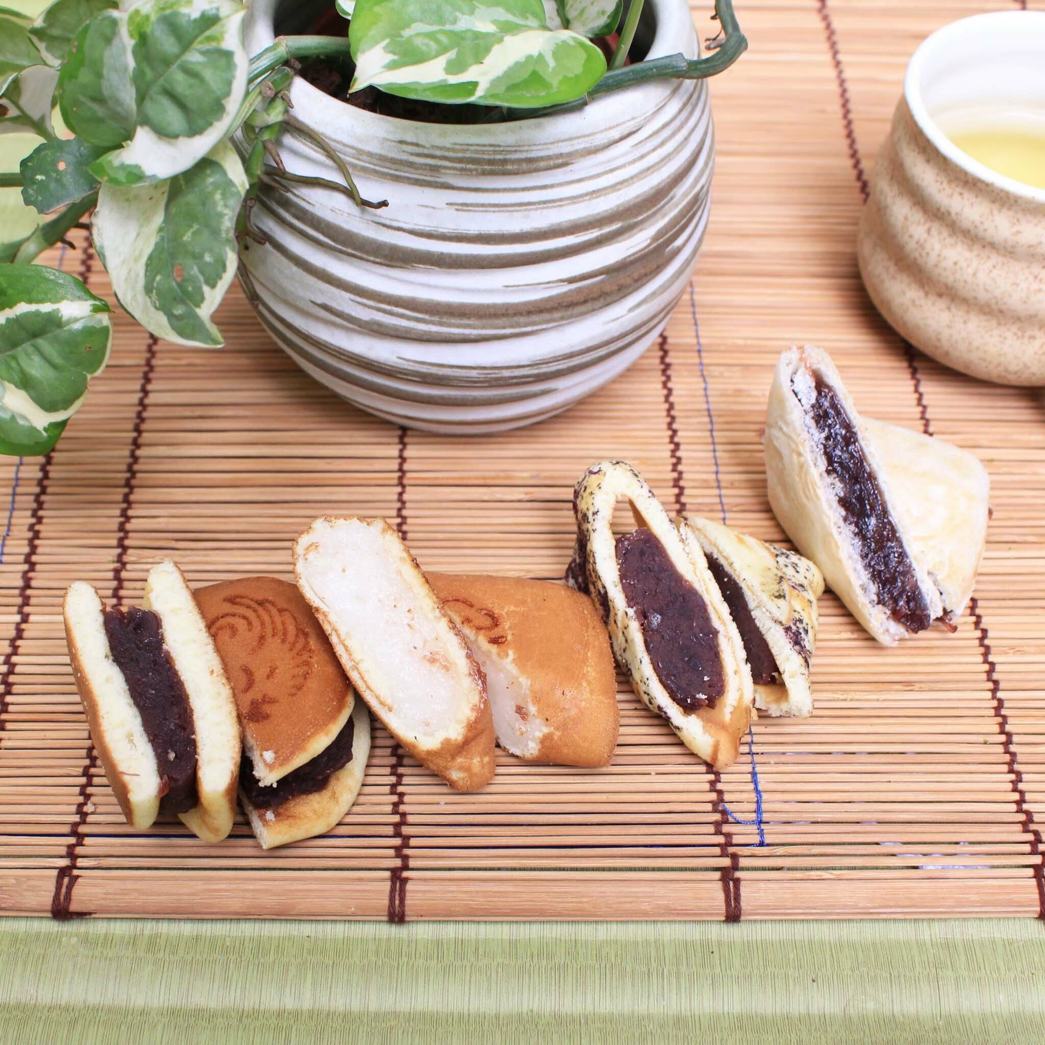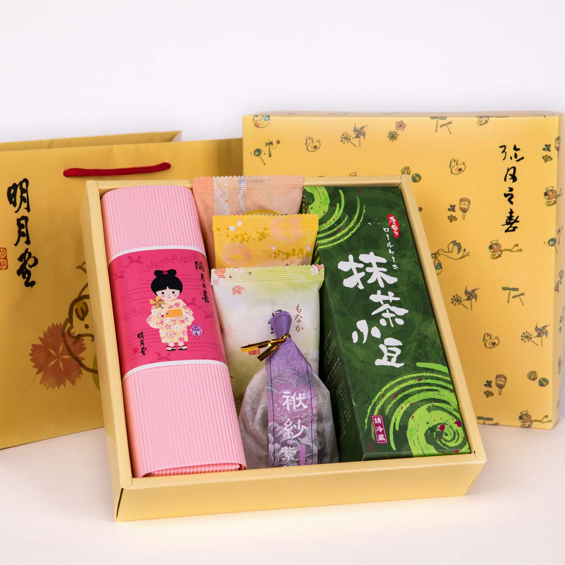 抹茶蛋糕卷x1條、綜合麻糬4入x1條、最中x1、牛皮x1、銅鑼燒x1、袱紗x1