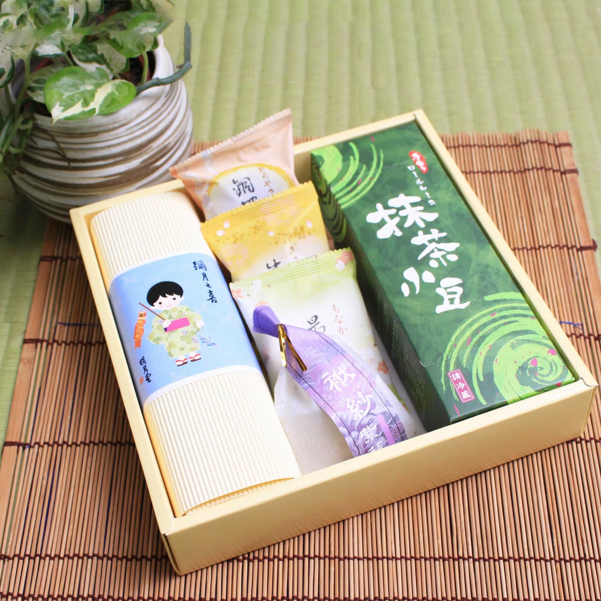 抹茶蛋糕卷x1條、綜合麻糬4入x1條、最中x1、牛皮x1、銅鑼燒x1、袱紗x1